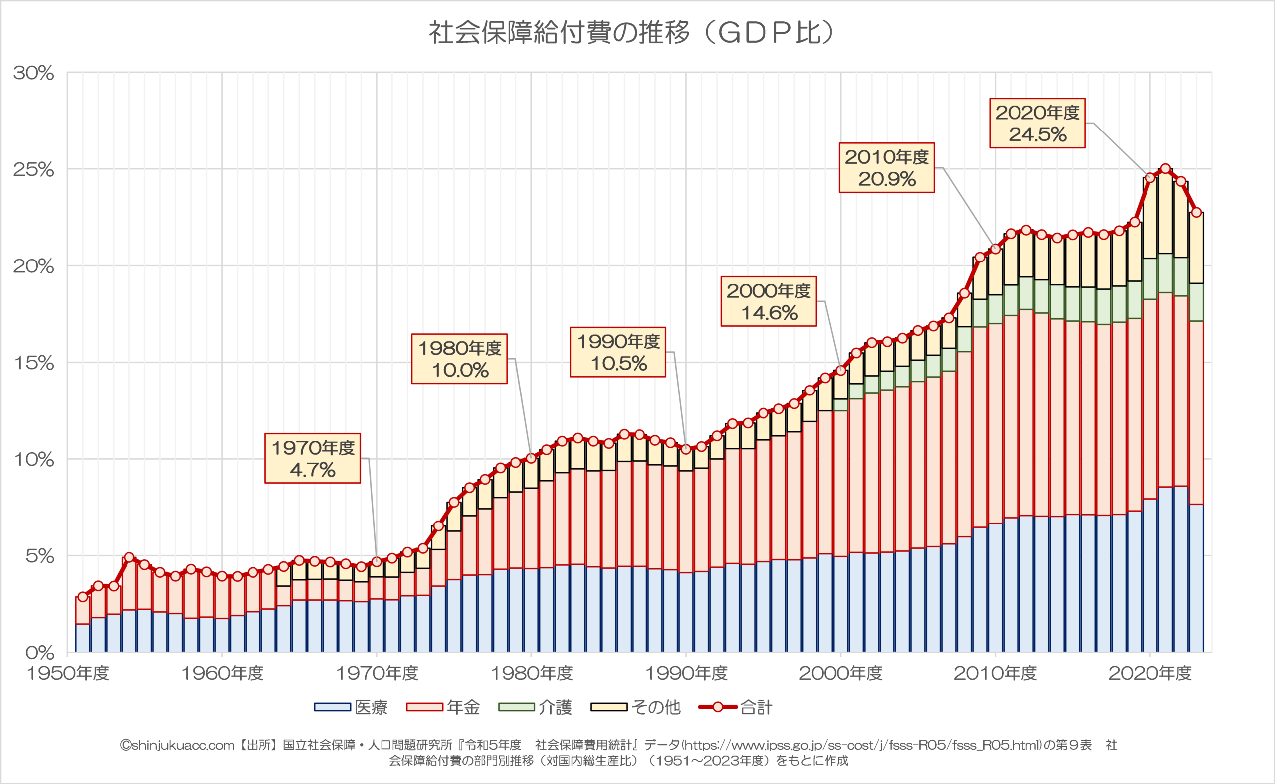 しかし、これをGDP比に置き換えても、やはり近年、社会保障費のGDPに対する割合が膨張していることがわかるのではないでしょうか?(図表3)