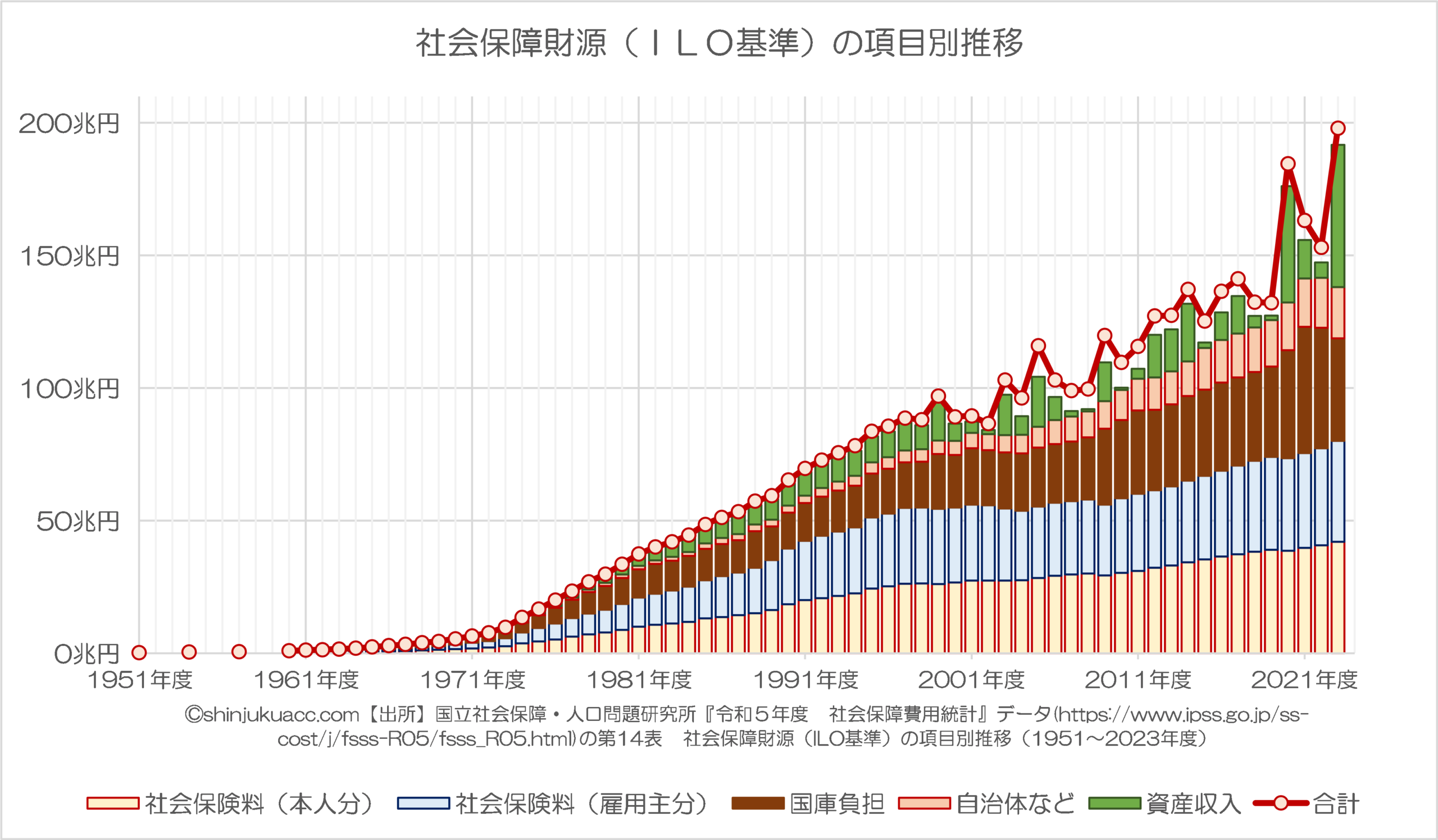 (【出所】国立社会保障・人口問題研究所『令和5年度 社会保障費用統計』データの第14表 社会保障財源(ILO基準)の項目別推移(1951~2023年度)をもとに作成