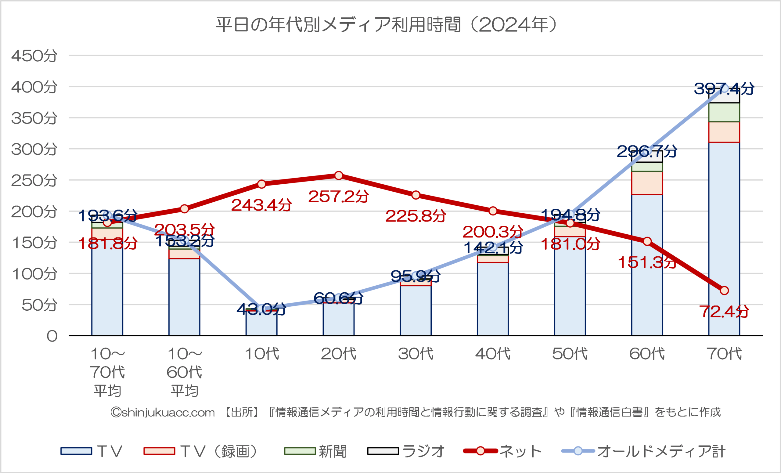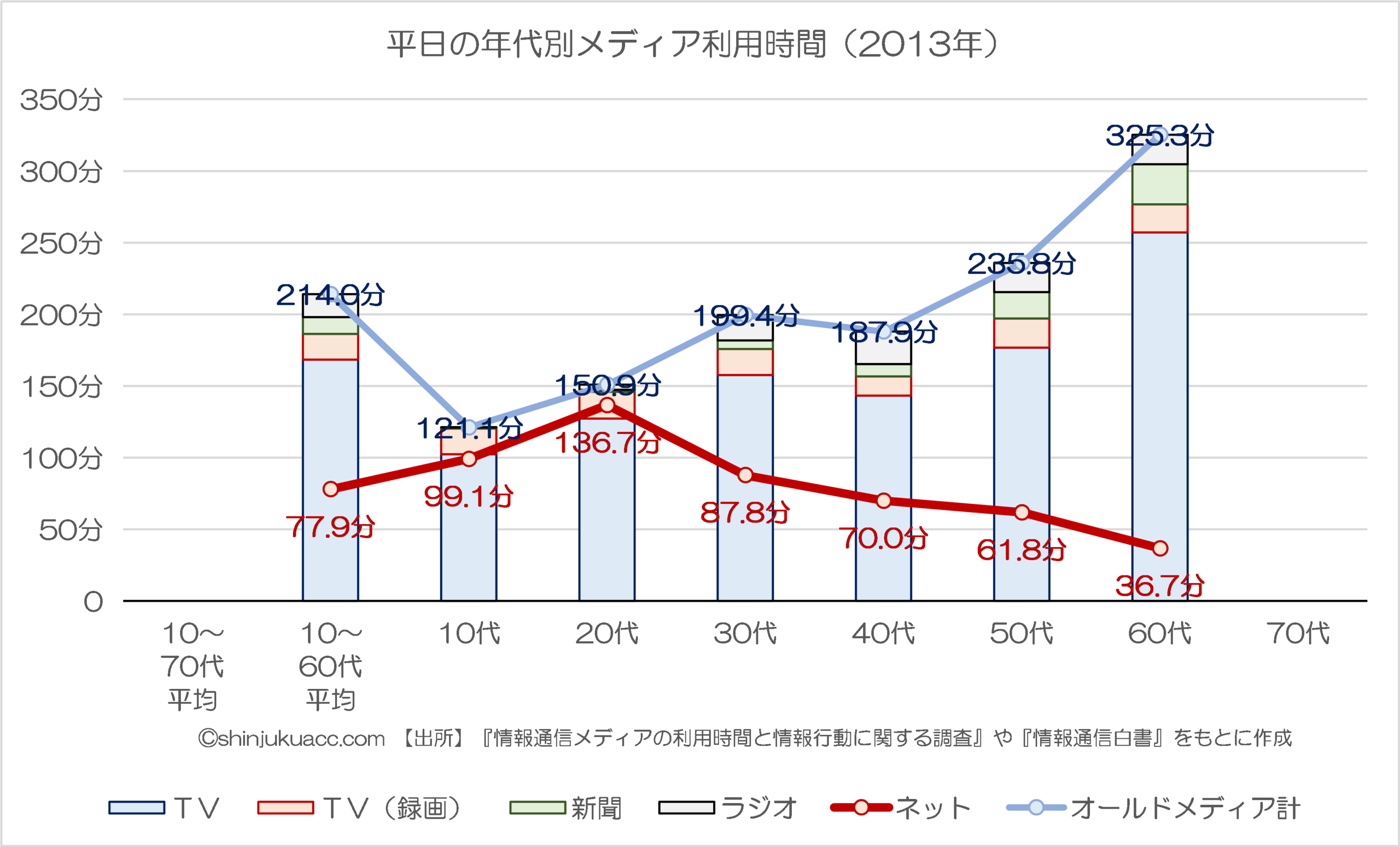 これによると、2013年時点の「平日のメディア利用時間」は、20代を除き、どの年代においてもテレビがネットを上回っていたほか、高齢層になればなるほどオールドメディア(※ここではTV、新聞、ラジオ)に接する時間が長かったことがわかります。